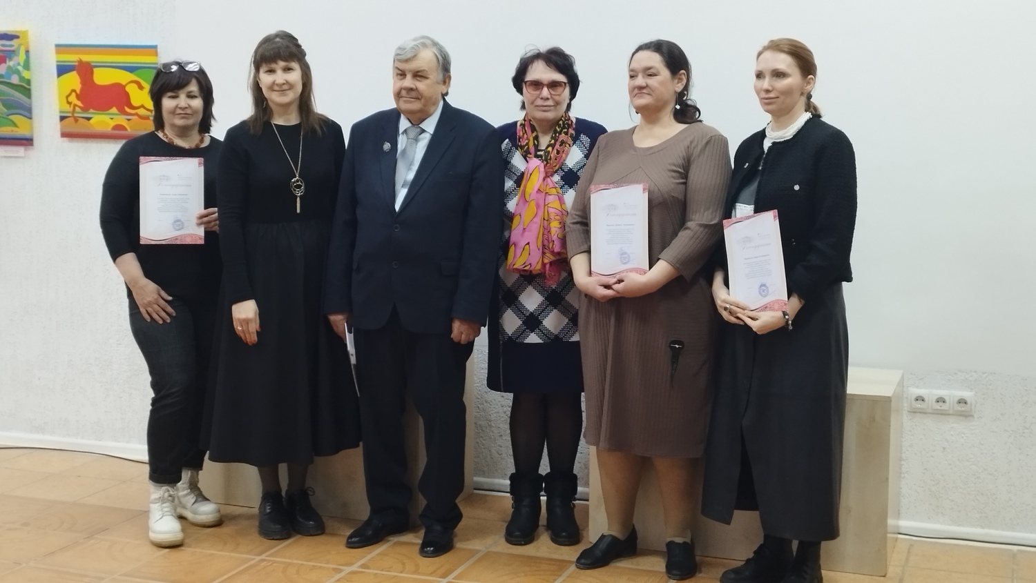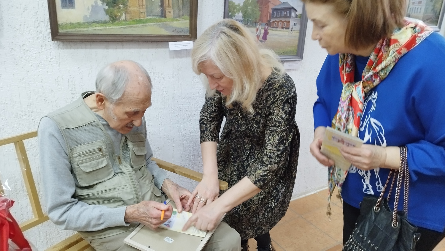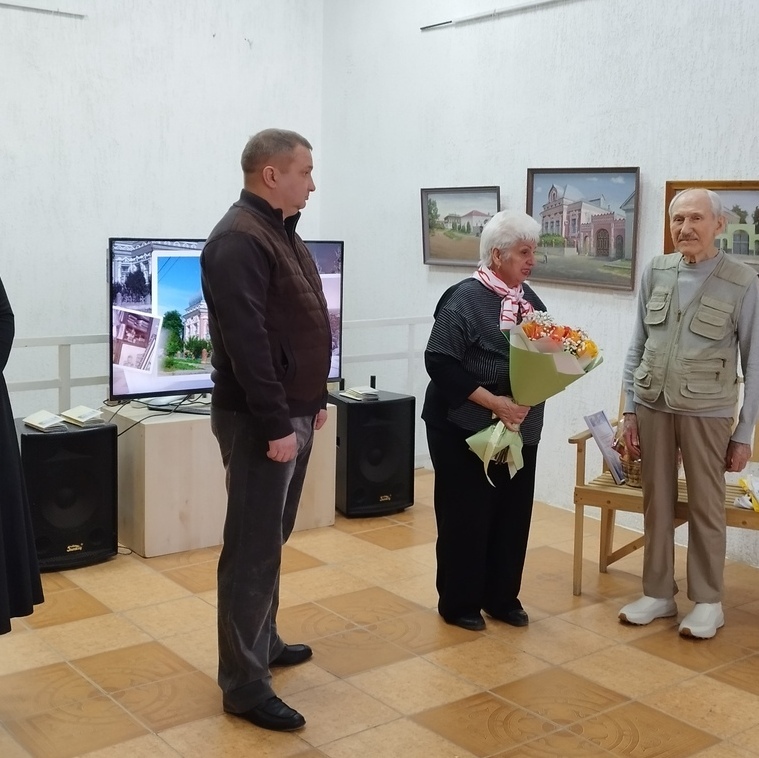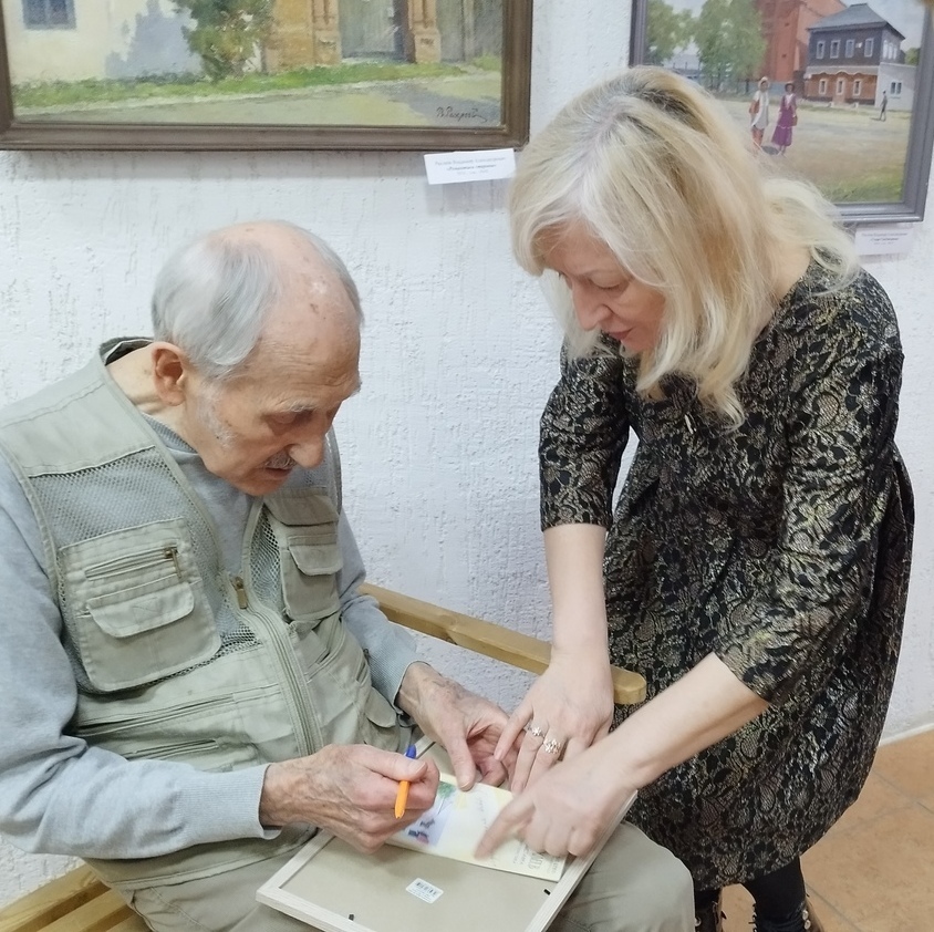 Заведующая музейно-выставочным центром Красноармейского района Надежда Безверхая вручает Александру Тимофеевичу Покатило Благодарственное письмо главы администрации Красноармейского района В.В. Короткова, добрые слова в адрес коллеги по художественному цеху звучат от художника Витола Дмитриевича Человского, благодарят своего наставника участники студии живописи и графики «Арт-Колор». Автограф-сессия… Выставка открыта.