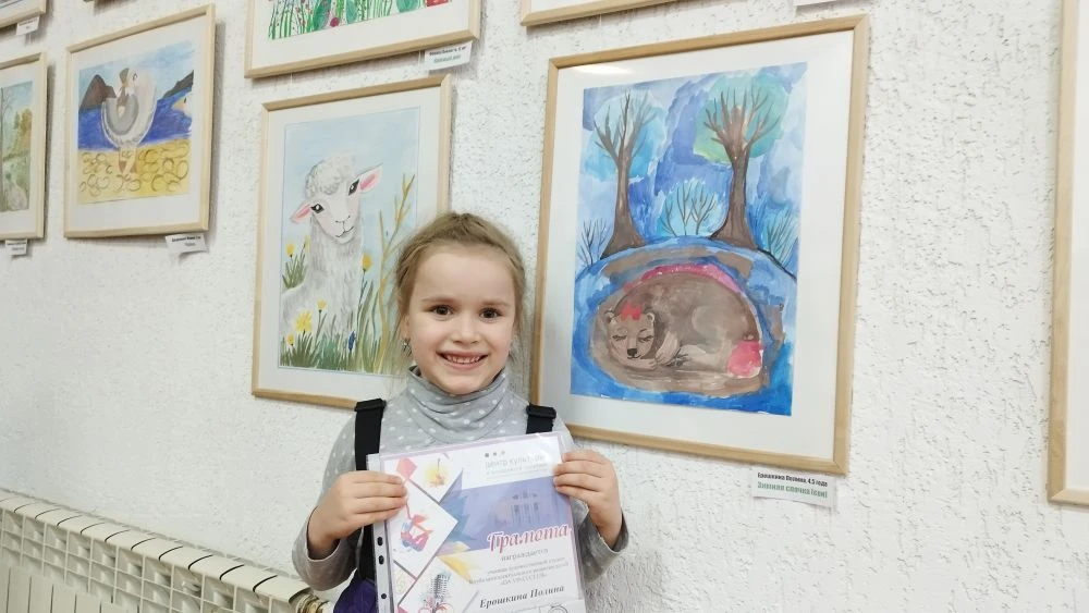 Мероприятие началось, когда дождались самую младшую из художников – Полину Ерошкину. В свои четыре с половиной года Полина участвует в выставке с полным правом, как начинающий, но уже заявивший о себе художник. Трудно оторвать взгляд от её работы – рисунка «Зимняя спячка (сон)», на котором под заснеженными деревьями в тёплой уютной берлоге спит, свернувшись калачиком, хозяин леса – медведь. Ещё труднее поверить, что автору чуть больше четырёх.