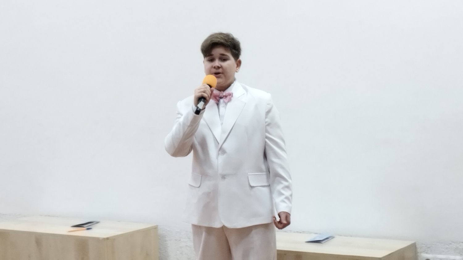 Приближалось время «Ч». Зал заполняли участники торжественной церемонии открытия выставки – авторы-студийцы и зрители. Среди них выделялся юноша весь в белом, лишь розовый галстук - «бабочка» - единственный цветовой акцент, да волнистые тёмные волосы оттеняли парадную экипировку солиста вокальной студии «Дети гаЛАКТики» и вокальной группы «Звёздные сны» Андрея Горгуля.