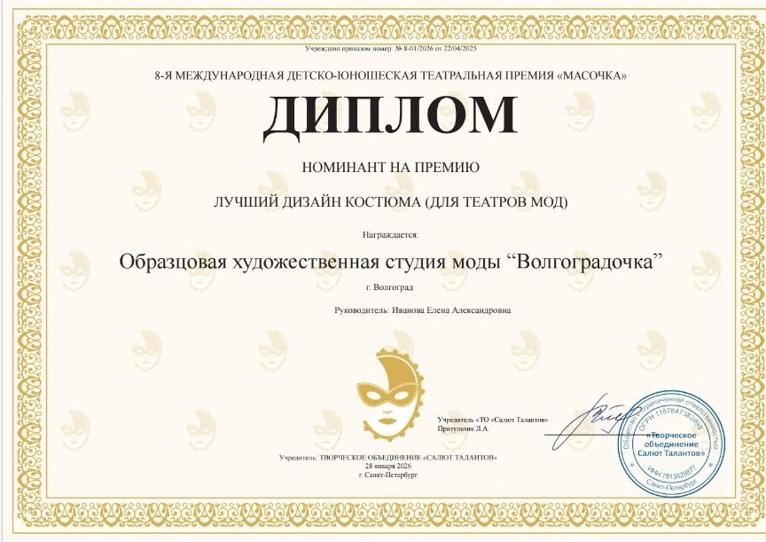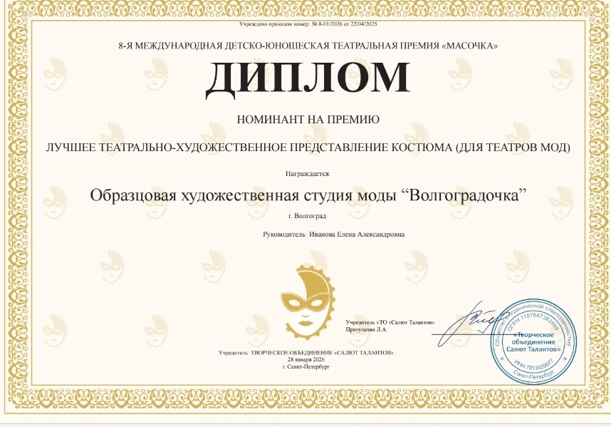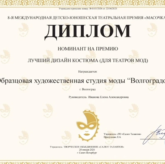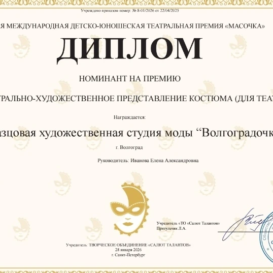 С 26 по 29 января 2026 года Образцовая художественная студия моды "ВолгограДочка" (руководитель студии "ВолгограДочка" Елена Александровна Иванова (Элен Ив) блистательно представила себя на VIII Международной детско-юношеской премии "Масочка". Этот масштабный театральный конкурс, собравший в этом году 1500 талантов из 15 регионов России, стал для этого коллектива знаменательным.Первое место в номинации "Театр моды 11-13 лет" за коллекцию стилизованных русских народных костюмов "Царевны Волго-Дона". Этот успех был отмечен не только победой, но и специальным призом – 10 000 рублей на поездку в марте этого года на Международную лигу моделей под руководством Юлии Вершины (Минск). Десять юных моделей с блеском представили коллекцию, а хореографы-постановщики Пронина А. Ю. и Лосева Т. А. внесли значимый вклад в выступление юных конкурсантов.Коллектив номинирован на звание "Лучший детский Театр Моды", а юные артисты прошли по красной дорожке Лахта-Холла, демонстрируя своё мастерство. Особое признание жюри получил дуэт Александра Коваленко и Есении Симановой, занявший первое место в номинации "Театральное творчество в номинации "Художественное слово. 5-7 лет" за проникновенное исполнение номера "БУКВА Р". Не осталась без внимания и коллекция "ЗОНТИК", созданная талантливыми дизайнерами Анастасией Маклецовой, Ксенией Петровой и Полиной Мунтьян, которая покорила сердца зрителей и членов жюри.Солистки театральной студии, Дэлина Ким и Анастасия Маклецова, удостоились серебряных наград за свои яркие номера "ПРАВДА И КРИВДА" и "Как меня музыке учили". Дипломантом 1 степени стал дуэт Миланы Черноусовой и Виктора Иванова за захватывающую театральную постановку "ПОМОГИ МНЕ".Поздравляем коллектив студии "ВолгограДочка" и его руководителя Елену Александровну Иванову (Элен Ив) с заслуженной победой!